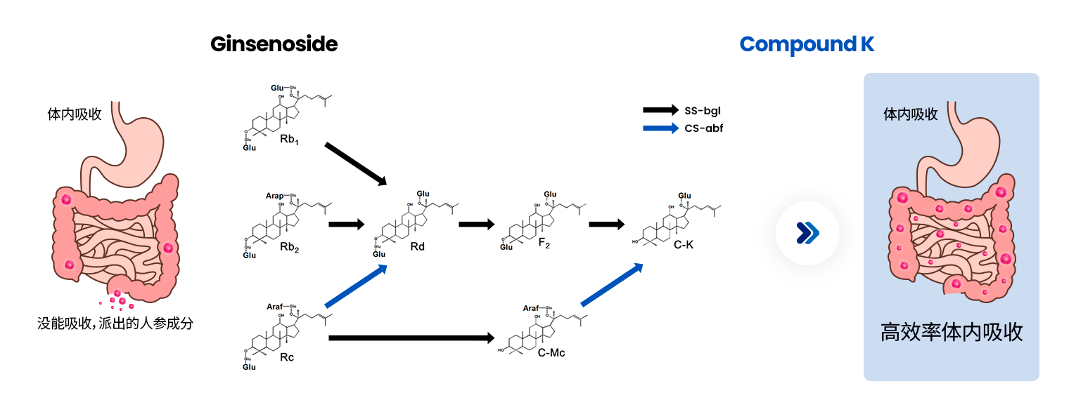 - 由于人参/红参中Compound K的含量非常低,因此选择含有高含量Compound K的产品对于实现更有效的效果非常重要。