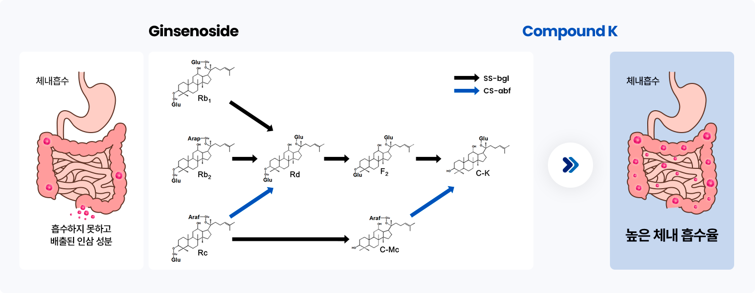 - Ginsenoside가 사람의 장내 미생물이 만들어내는 소화 효소에 의해 분해되어 생성